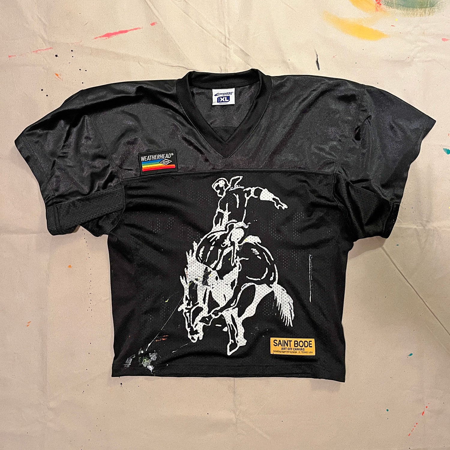 This is a one-of-one youth practice football jersey featuring the "Buckin' Bronco screen printed by hand, along with individually hand-painted and distressed finishing touches.