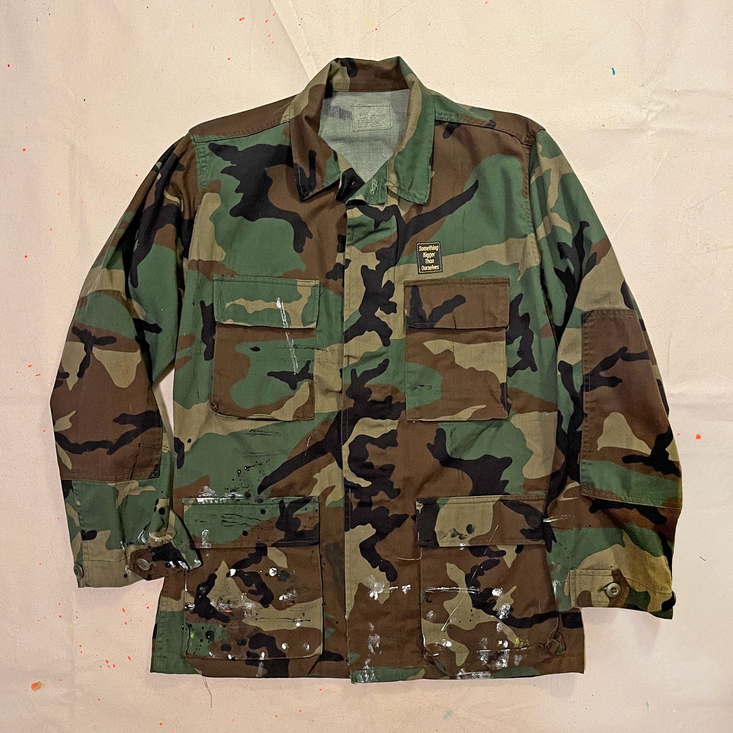 This is a one-of-a-kind, vintage, woodland camo army jacket featuring the DREAM quote screen printed by hand, along with individually hand-painted and distressed finishing touches.